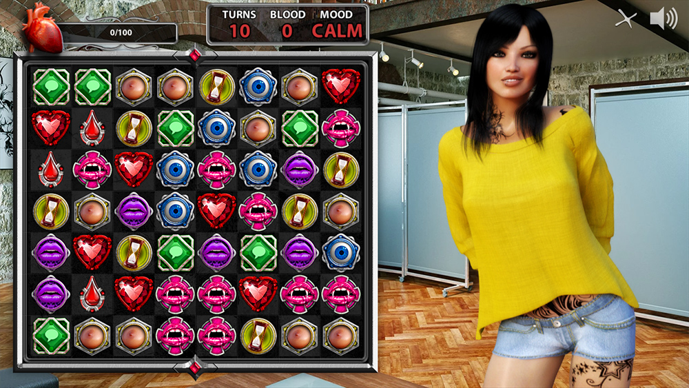 To influence a girl, you’ll need to play a MATCH 3 game with them – line up three or more similar gems to gather substance points, gain new blood or extend the number of turns available in each game. But it isn't that simple: girls can change their mood, and their new circumstances may require a unique combination of gems to get extra points.