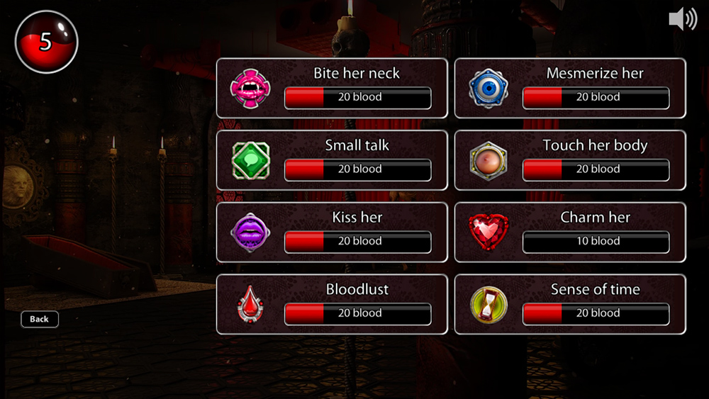 In your CRYPT, you can evolve as a vampire and become increasingly powerful, earning you more points for each MATCH 3 game you play. Moreover, some situations will require special skills that need to be obtained, such as using MESMERIZE so a girl will trust you or VAMPIRE’S KISS to increase her lust.
