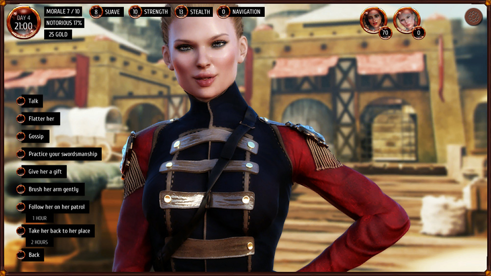 Balance your time and energy between keeping your crew happy, your pirate stats high enough, and your heart filled with the love of the most fetching ladies in the Seven Seas. Shawn will not only need to be a handy fighter, navigator and thief, but also impress the (almost surely not) maidens with suave and fancy accessories.than one girl fall for you and lure the both of them to a spicy threesome.