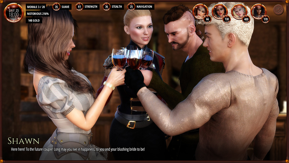 Return to the Royal Port with Shawn Grey and his sensual ladies of the sea with this Man-O-War sized update! Continue the story of being a pirate and hiding in plain sight in an enemy port while planning the breakout of your fellow Captain Perry but with far more saucy distractions along the way. Enjoy both solo and threesome action with your naughty lady-friends, finally “get to know” your captain while she is behind bars, and reap more rewards for helping your female companions with their missions!