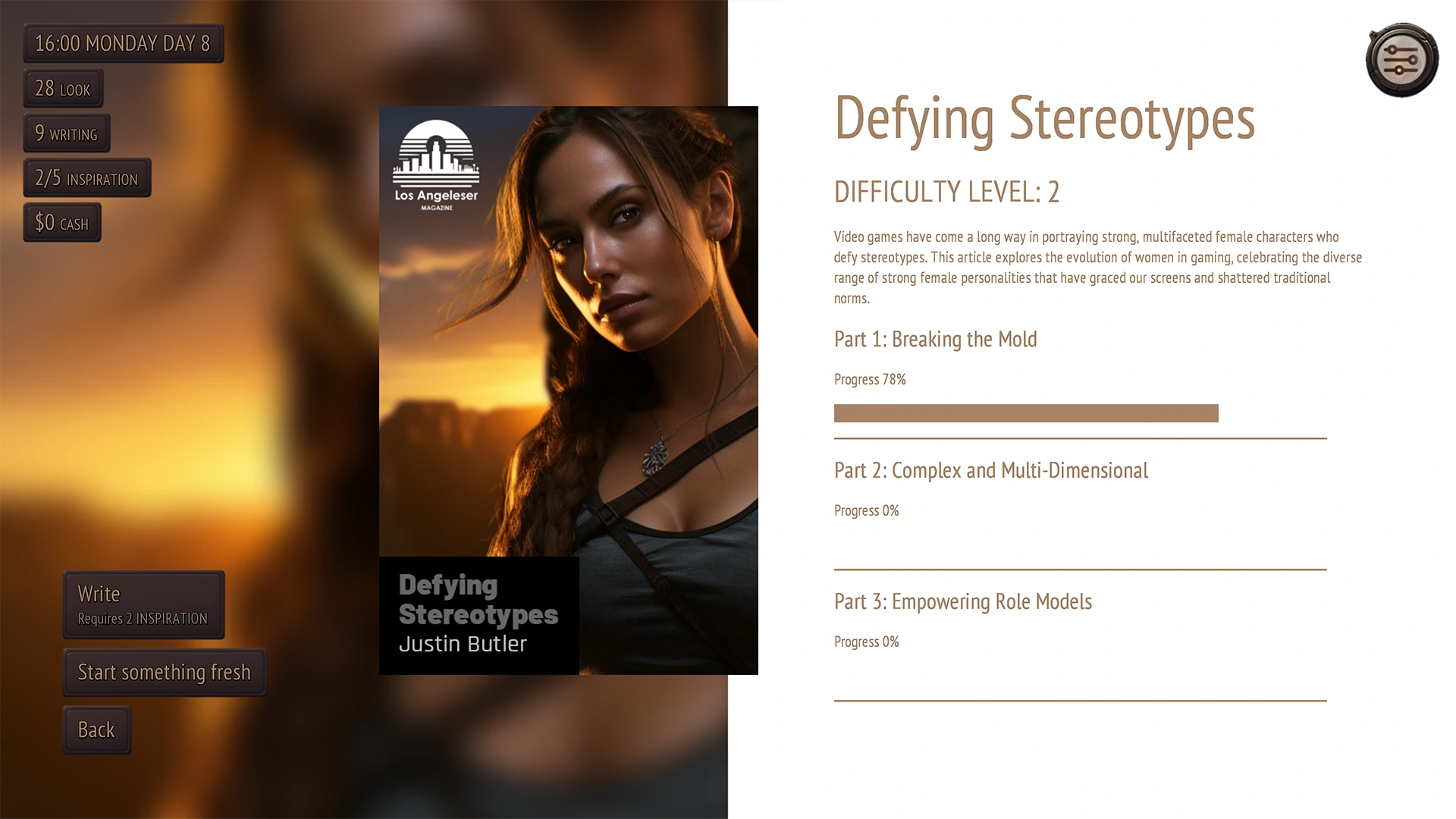 - In the game's original version, Justin was writing columns for the Los Angeleser. The whole process was simplified and not attractive - just click buttons with the number of words you want to write and push the wiring progress forward until you complete your task and get money. Here I've expanded this concept much further. Are you still gonna be working for this magazine, writing columns but now you'll be able to select the articles you want to write (from an already predefined list). Every article has its own cover, title, synopsis and short descriptions of 3 chapters. Depending on your writing skills and article difficulty, you'll complete a fragment of the article with your texts every attempt. Completing a chapter will benefit presenting the shortcut on the screen, allowing you to feel like a real writer. What's more, new career opportunities await and next to the articles you'll also write spicy romantic novels - contemporary, about different cultures and criminals. Finally writing is going to be rewarding!