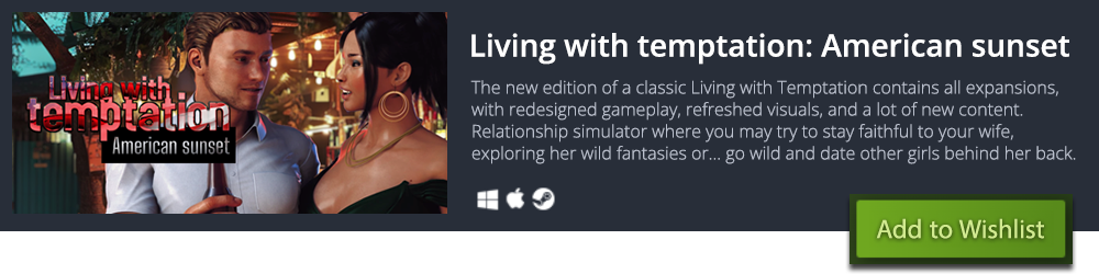 We've now started to render remodeled Vegas scenes, including new characters in the wet t-shirt contest. Those characters, Amanda with her husband Blake and the blonde-haired Courtney will have much more meaningful scenes in the future. Also, we're preparing many new daily activities for LEVEL 2 and LEVEL 3, including various sex sequences.