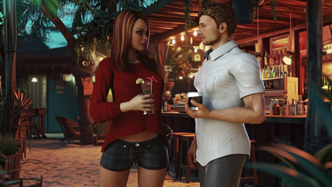 Additionally, we are creating new settings that will be utilized later in the game. For instance, as Tracy has a suspenseful encounter with a stranger, Justin observes from the grimy staircase. Later on, Amber and her husband Blake plan a date for them to partake in spouse-swapping with Tracy. This scene will continue to escalate as they invite Justin and Tracy to their beach house for a sensual and exhilarating experience.