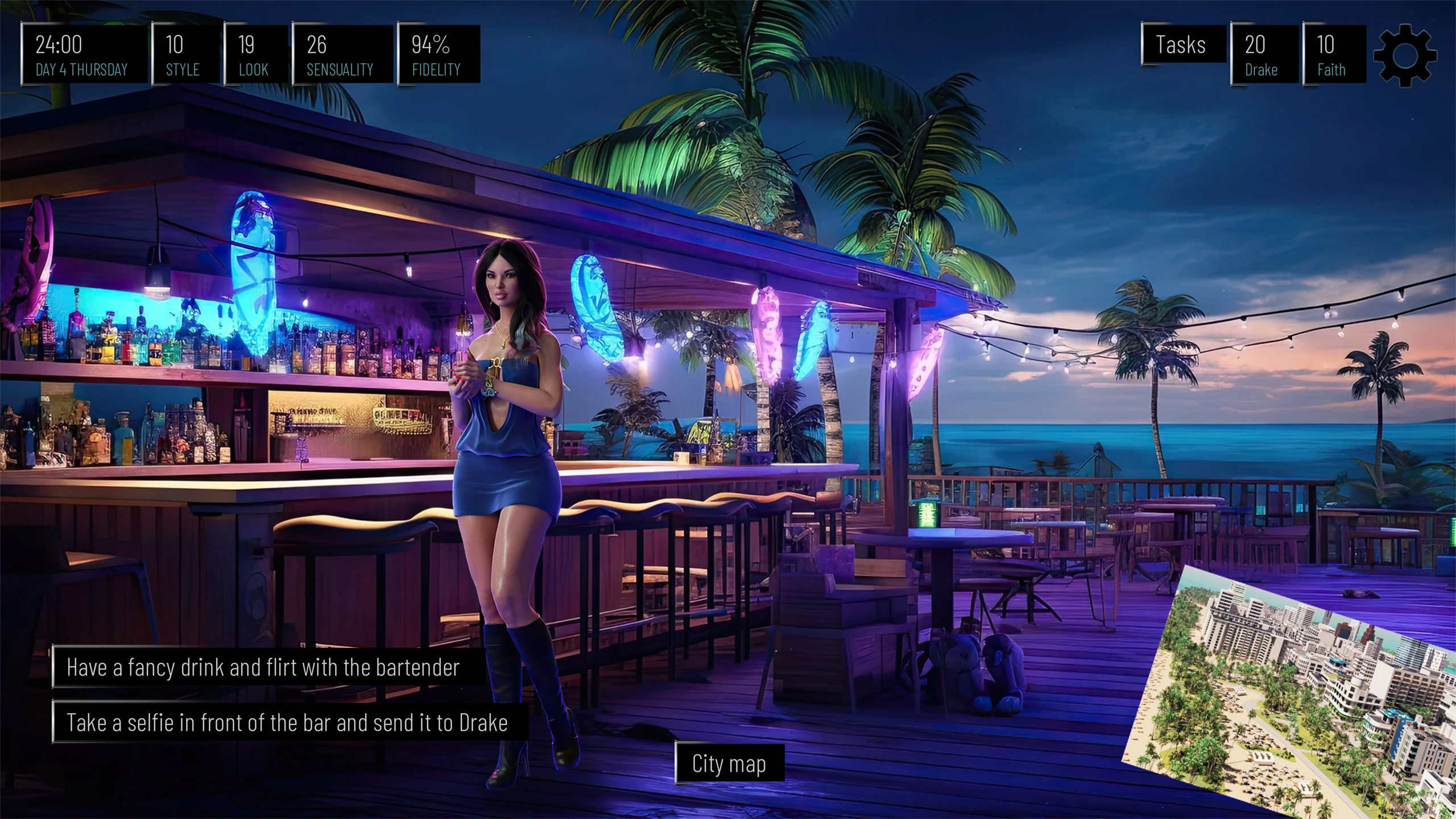 I'm about to complete the part where you're able to travel around the map, interact with the characters and build relationships with them through daily actions. Still, there is something to code and test, but this element is working already. The game interface will be redesigned because I want to present more stats on the screen, like Eleanor's arousal level and stats related to her career.