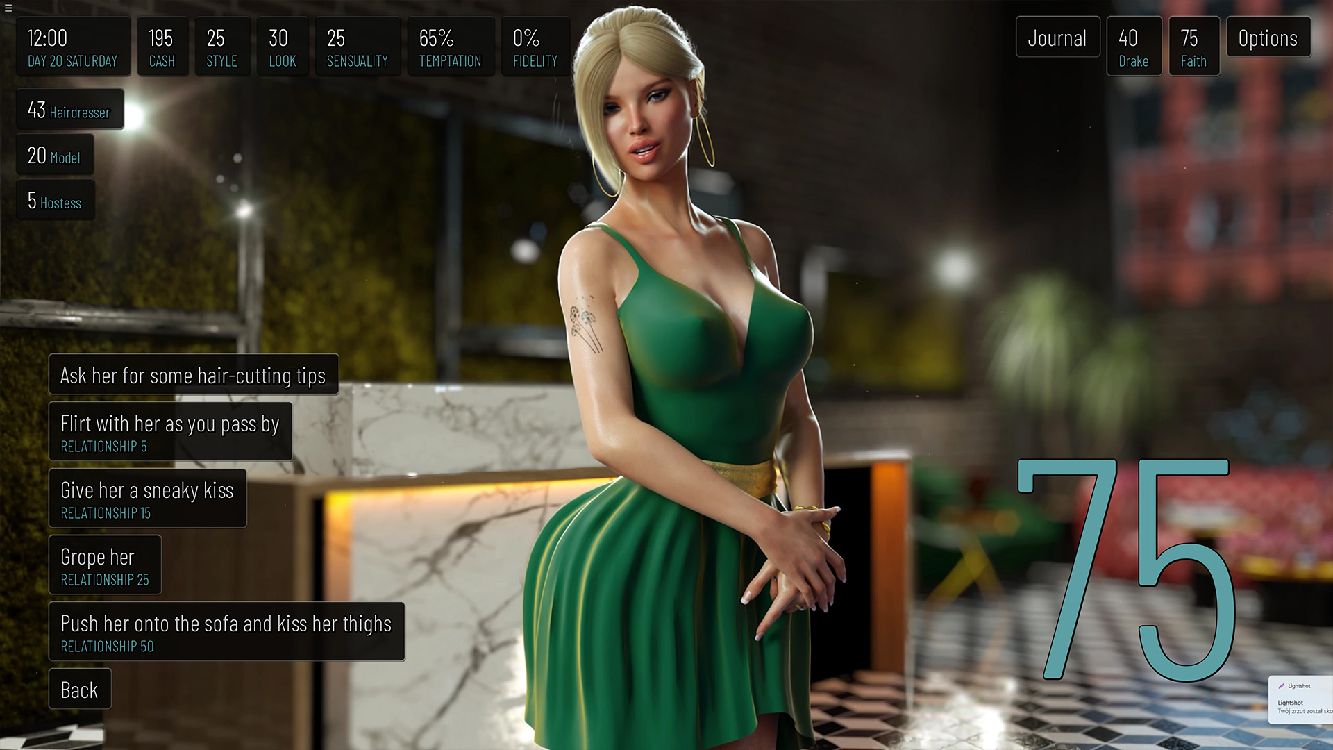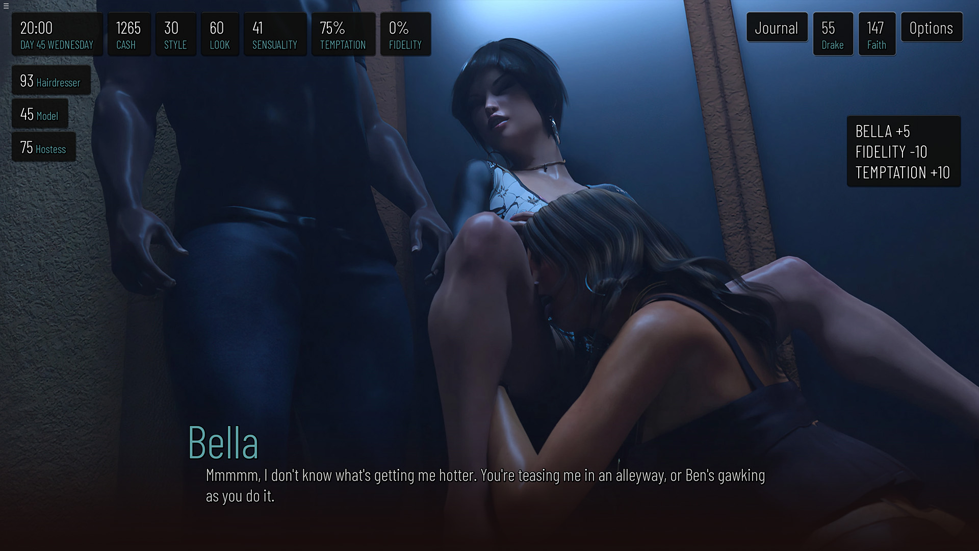 The skin textures seem to be off too. everyone is shiny and wet looking. have a look at Faith’s ass in her scene with Drake and tell me if that looks like natural skin or not. Having said that, there are occasions where I am blown away, like the light glittering off Eleanor’s stockings in the VIP room. Simply stunning. But overall, I think the graphics, which are apparently the reason why the game took so long to develop, are just not up to par, really. Also, because of the way the scenes are rendered, quite often the “good parts” are covered by the text. Also, some of the framing selections for the touted “second angle” were quite uninspiring, hiding the things we want to see, even though we’d just spent 4 dialogue screens wating it in the “first angle”.